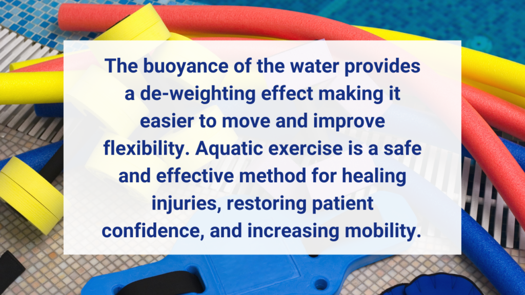 The buoyance of the water provides a de-weighting effect making it easier to move and improve flexibility. Aquatic exercise is a safe and effective method for healing injuries, restoring patient confidence, and increasing mobility. There are also many health conditions that benefit from water-based exercise or aquatic physical therapy, including: