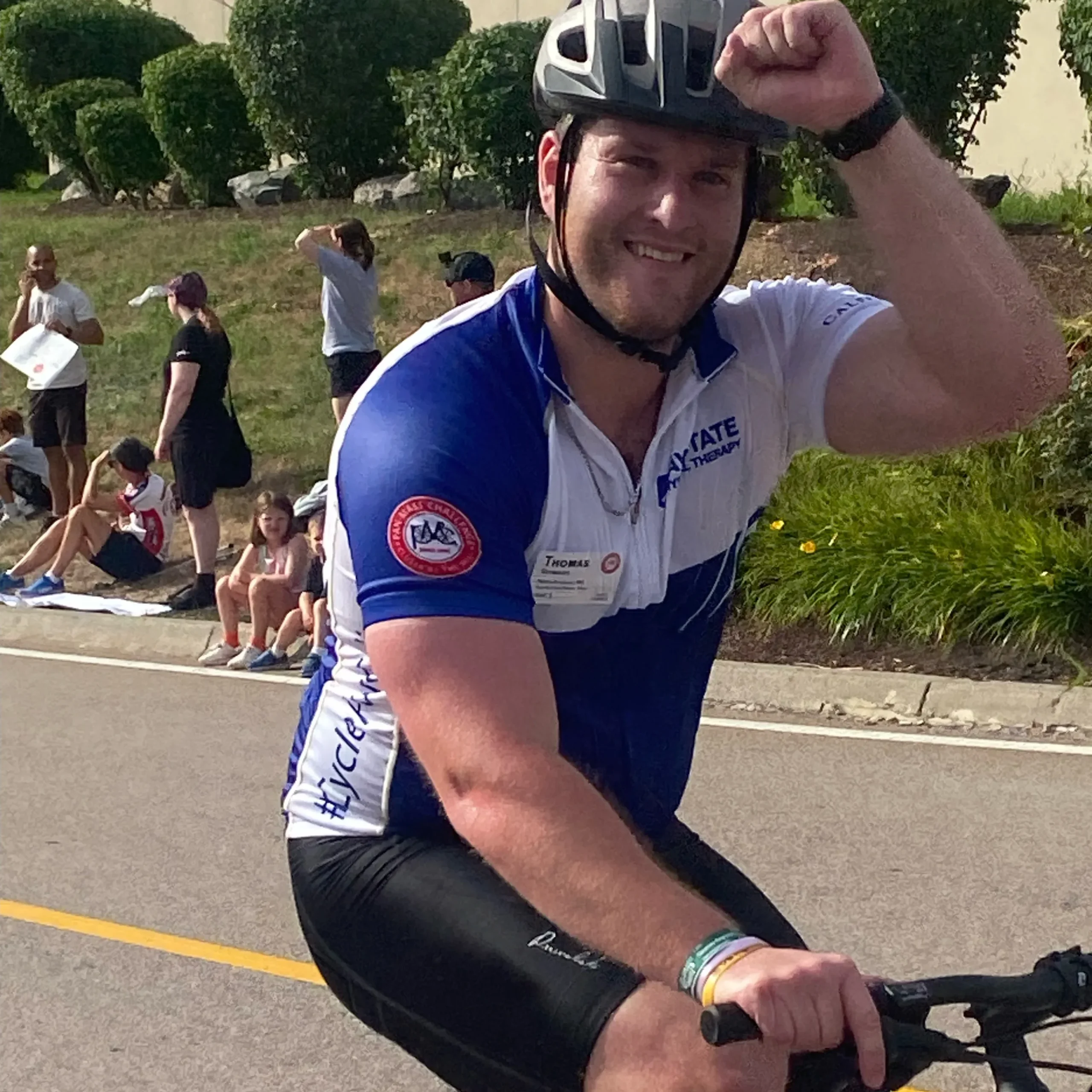 “This will be my second year riding in the Pan-Mass Challenge on the Bay State PT Riding Team alongside my boyfriend, Nick! I’m dedicating my ride to everyone impacted by cancer, especially my Uncle Tommy, who passed away at just 22 from leukemia. My mom, who runs marathons in his memory, once told me: ‘The pain he endured will never come close to the temporary pain you’ll feel during the ride.’ That’s stayed with me. I’m honored to ride in his memory and to support a cause that brings hope to so many.”