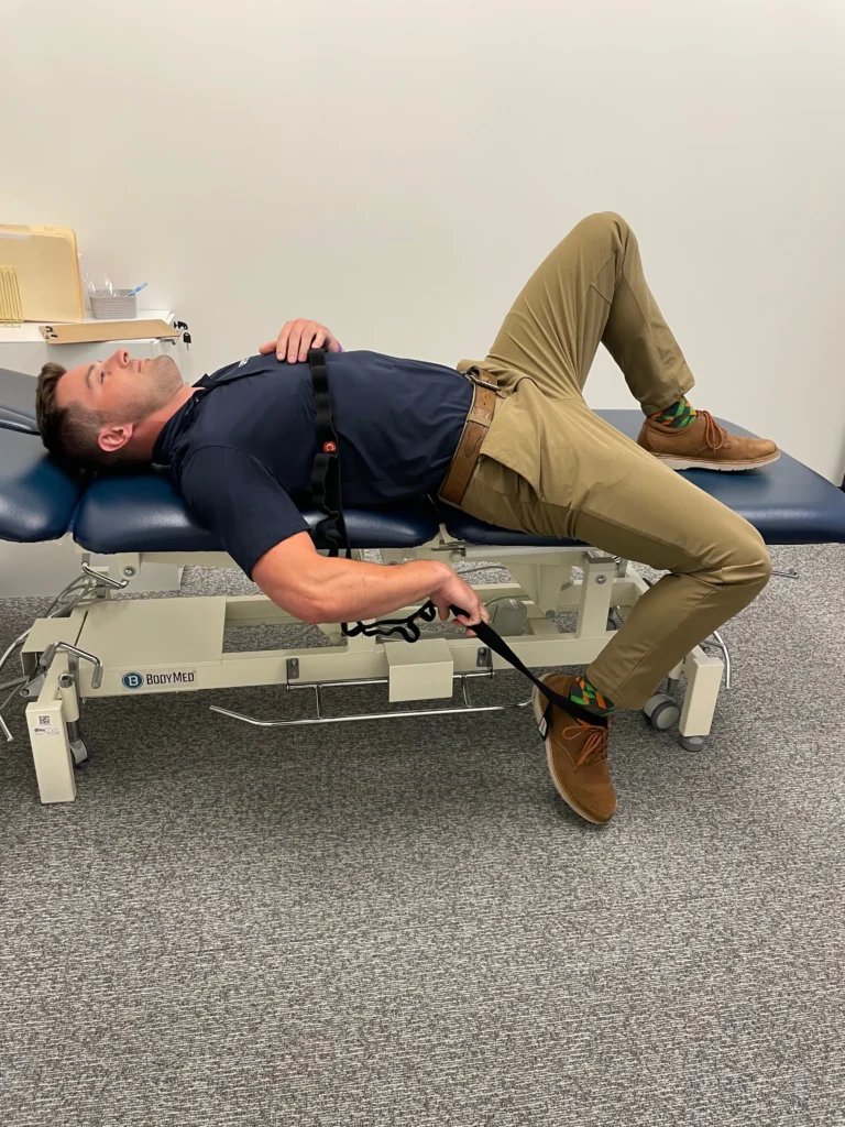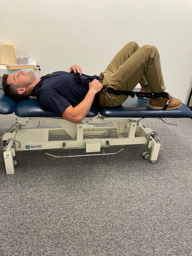 - Begin lying down on your back, towards the edge of the table or bed with both knees bent