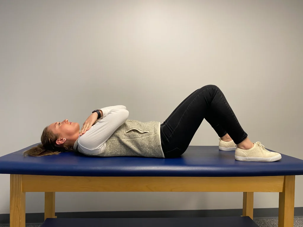- Lie on your back with your knees bent and arms across your chest