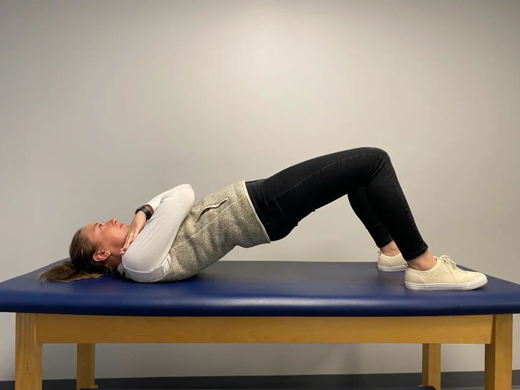 - Raise your hips off the surface creating a “bridge” with your body