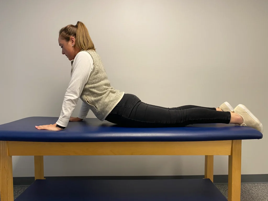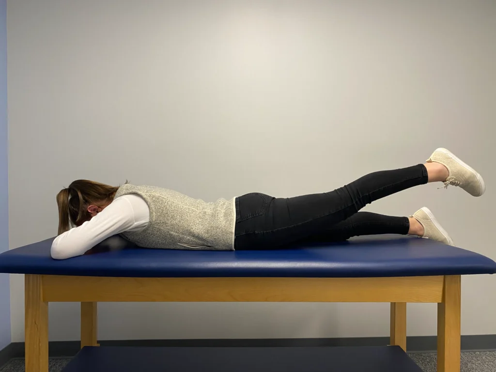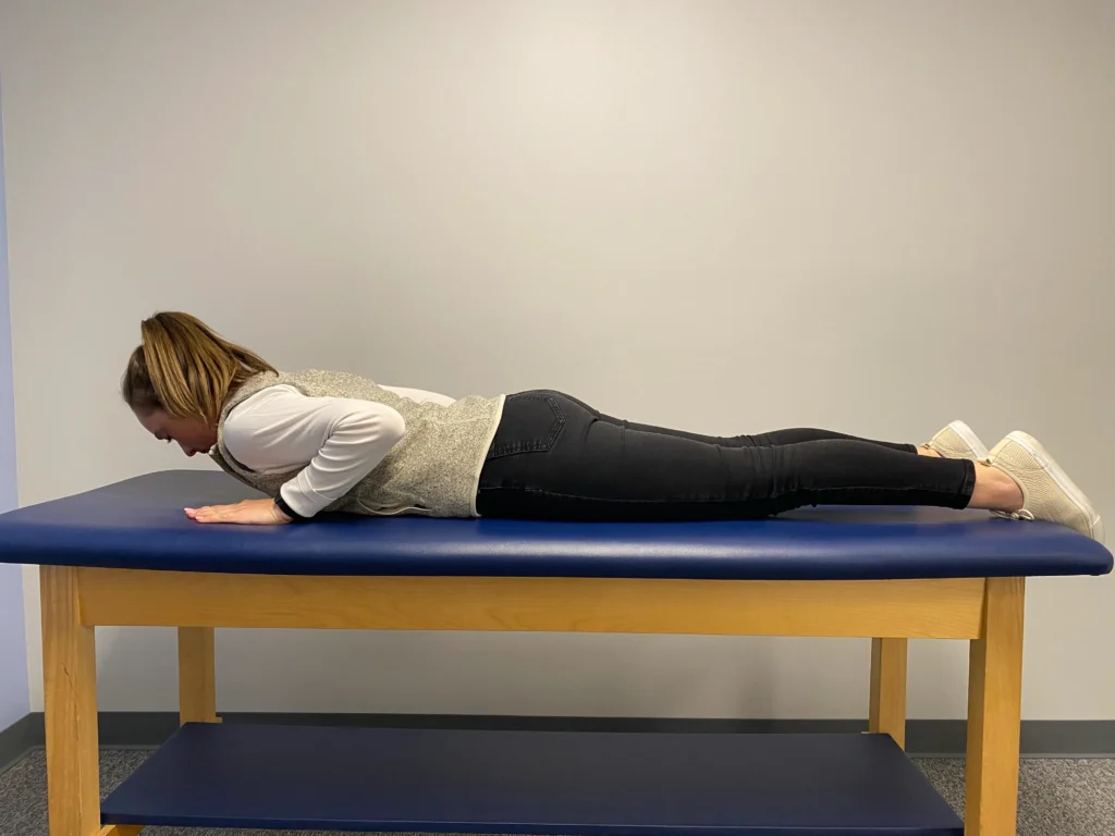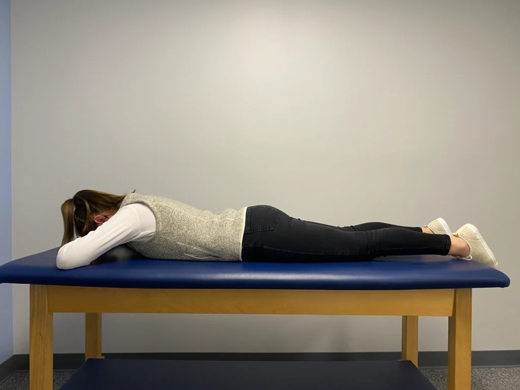 - Lie on your stomach, keeping your knees straight and supporting your forehead on your hands to maintain a neutral spine position