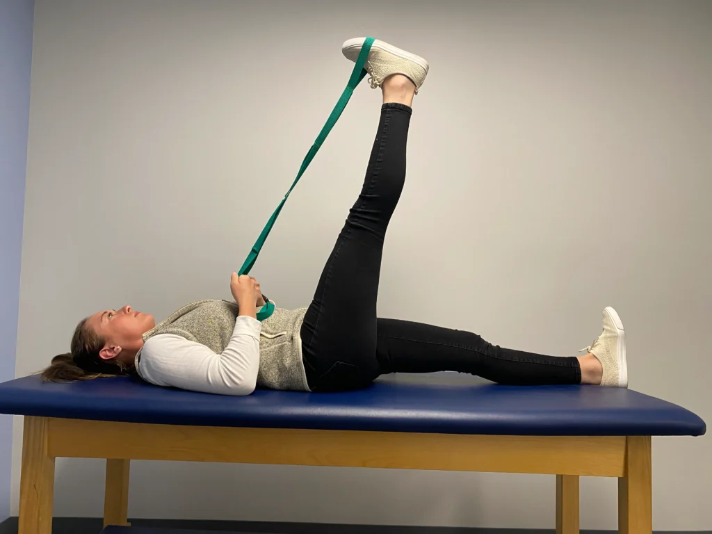 - Using your upper body, raise the leg off the floor, keeping the leg straight until you feel a gentle stretch in the back of the leg
