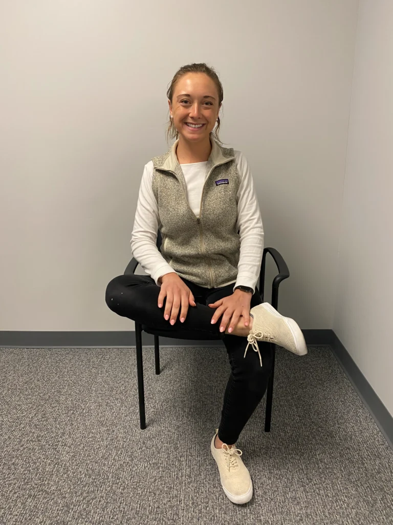 - Sit up straight at the edge of a chair with one ankle resting on the opposite knee