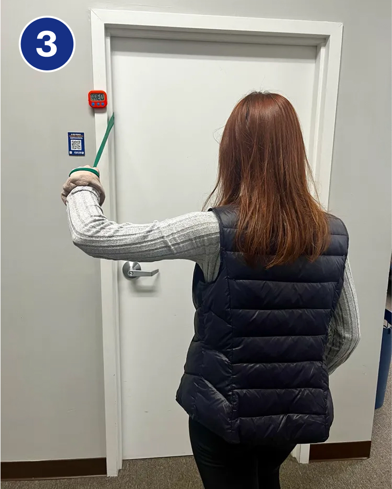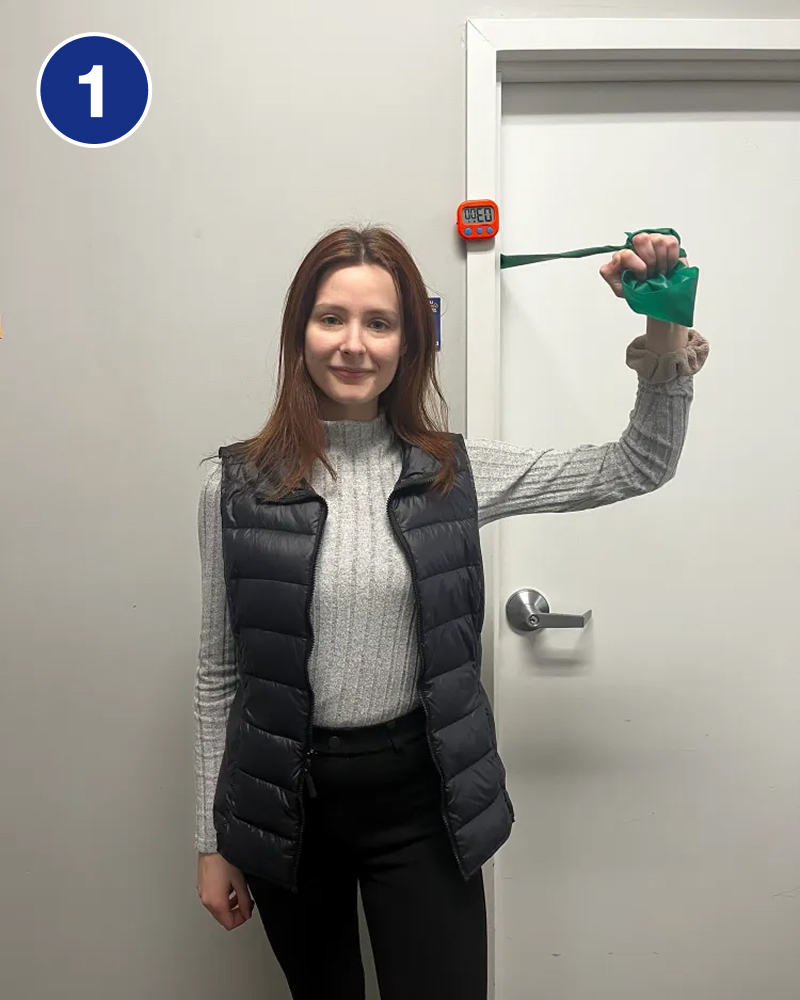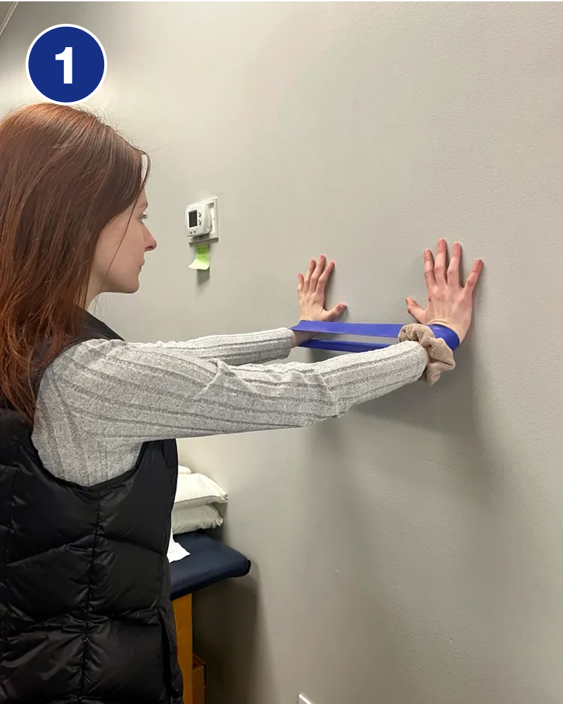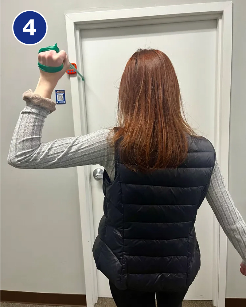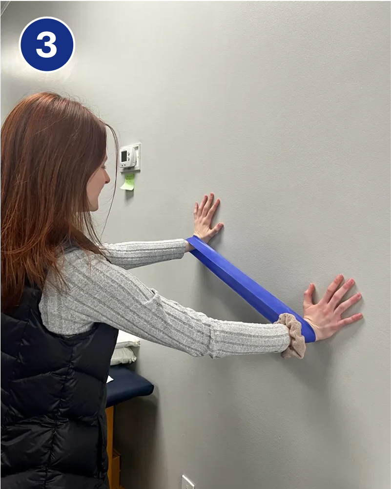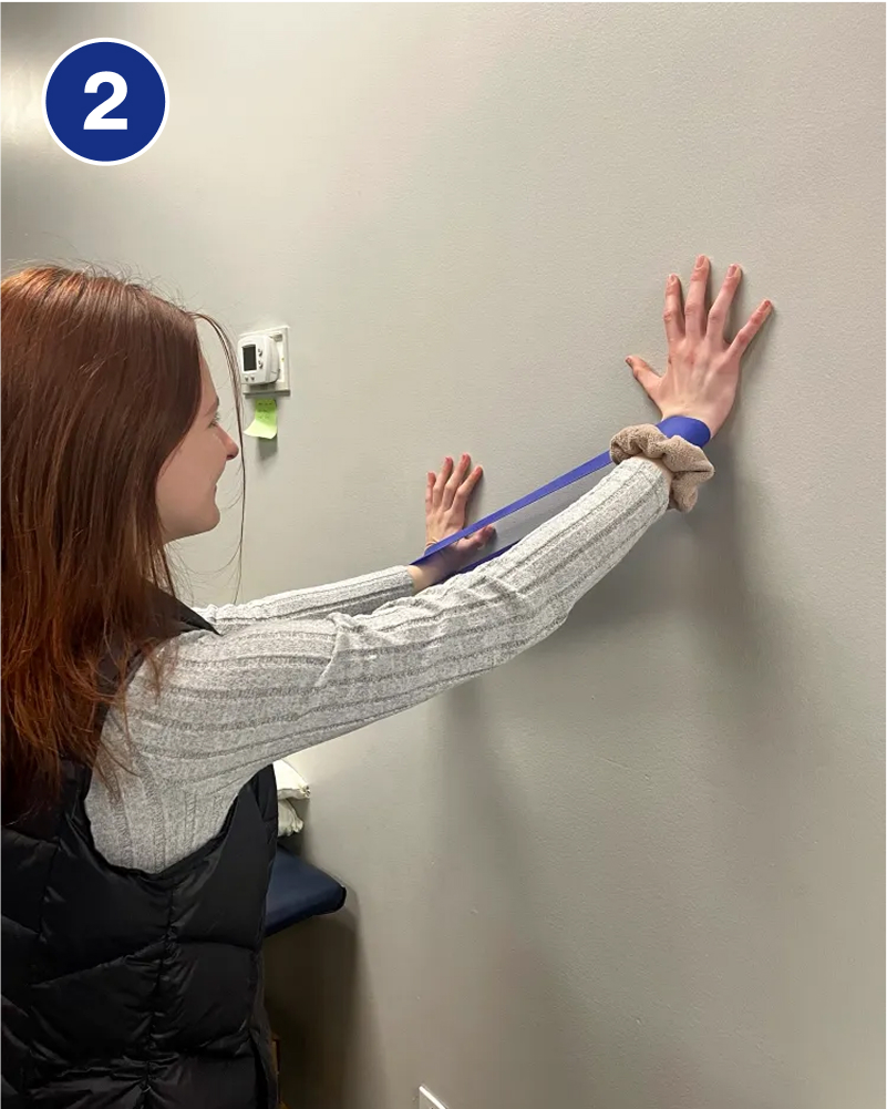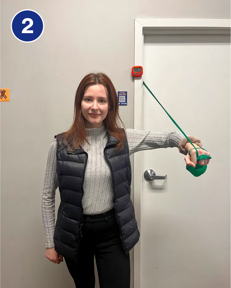 • Maintaining good posture and shoulder blade control, rotate your arm upward from horizontal to vertical, keeping slight tension on the resistance band
