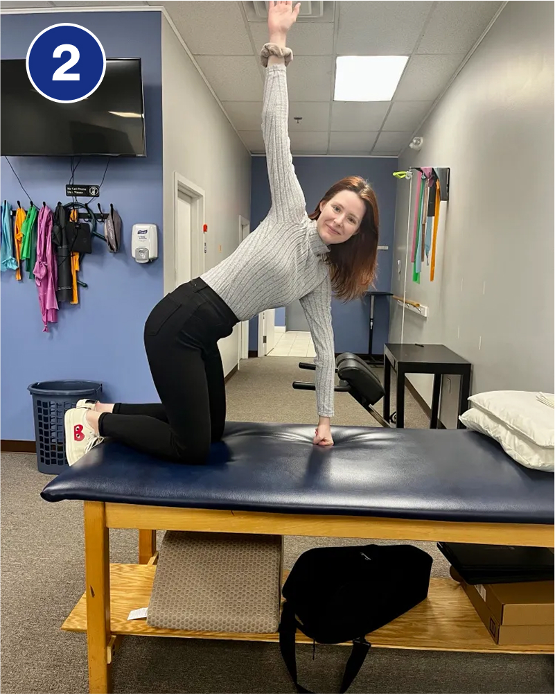 • Keep one hand in place throughout as you move the other hand up and out diagonally to a 1 o’clock position, pausing before returning to the starting position