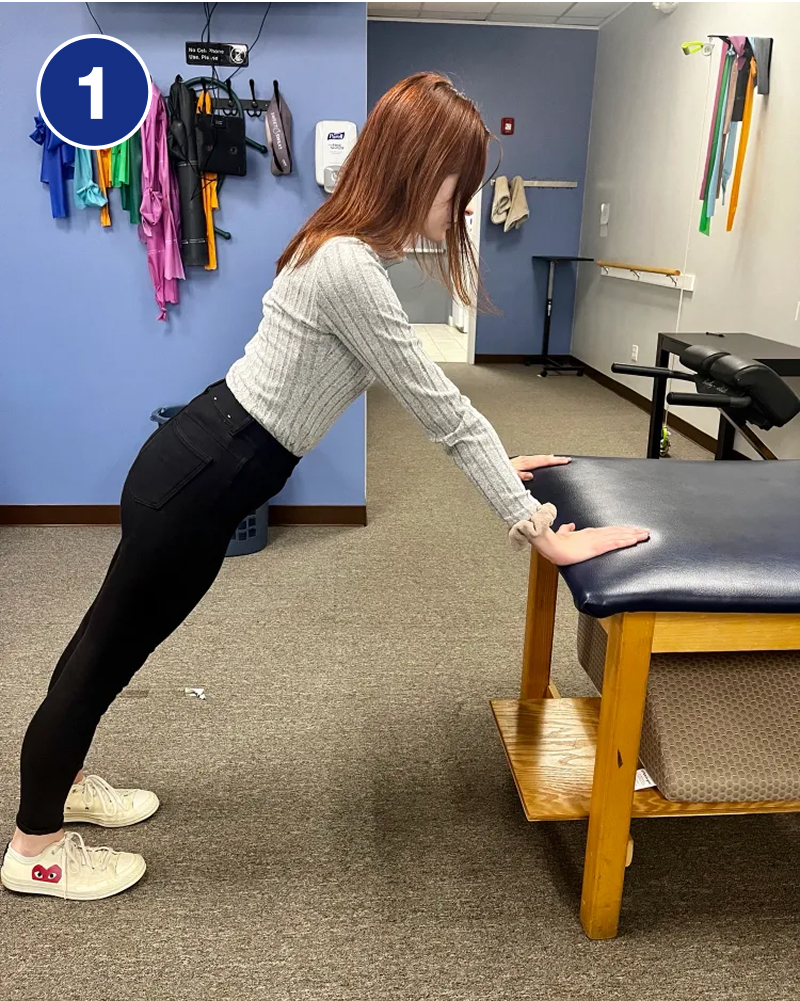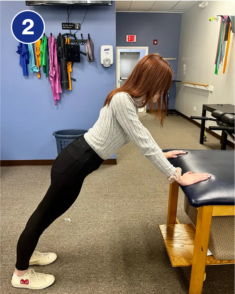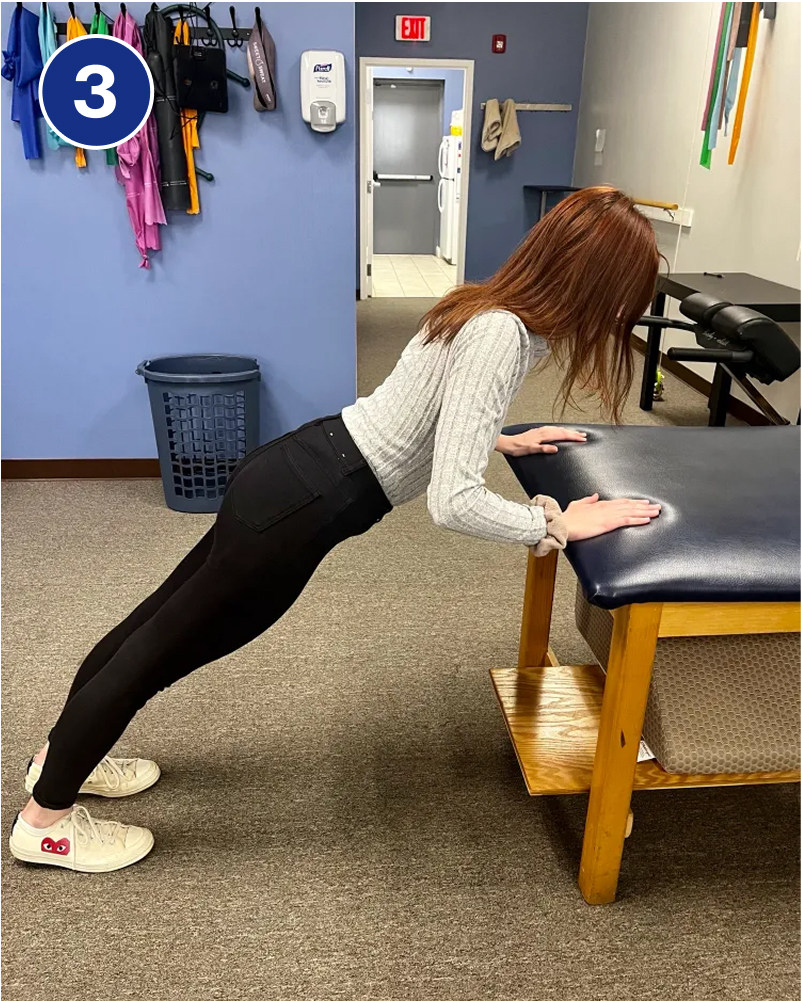 • Leaning on a countertop or edge of a sturdy couch, position your body with your arms straight and your abdominals engaged