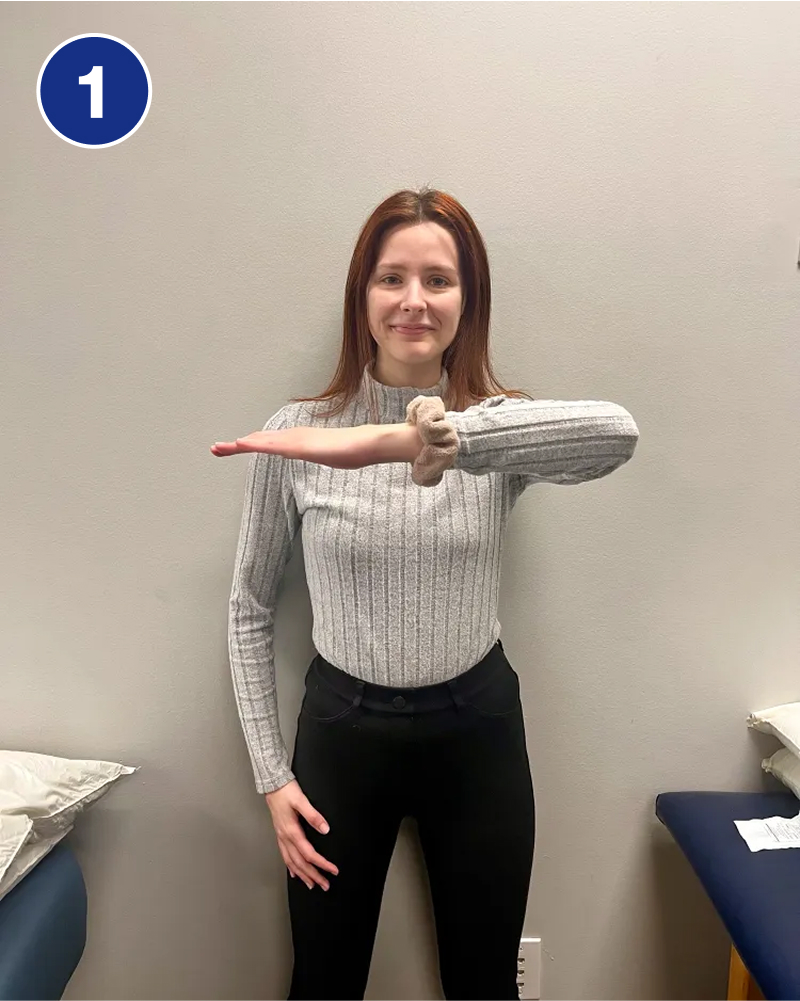 • Lift one arm up and in front of your body with your elbow flexed at 90 degrees