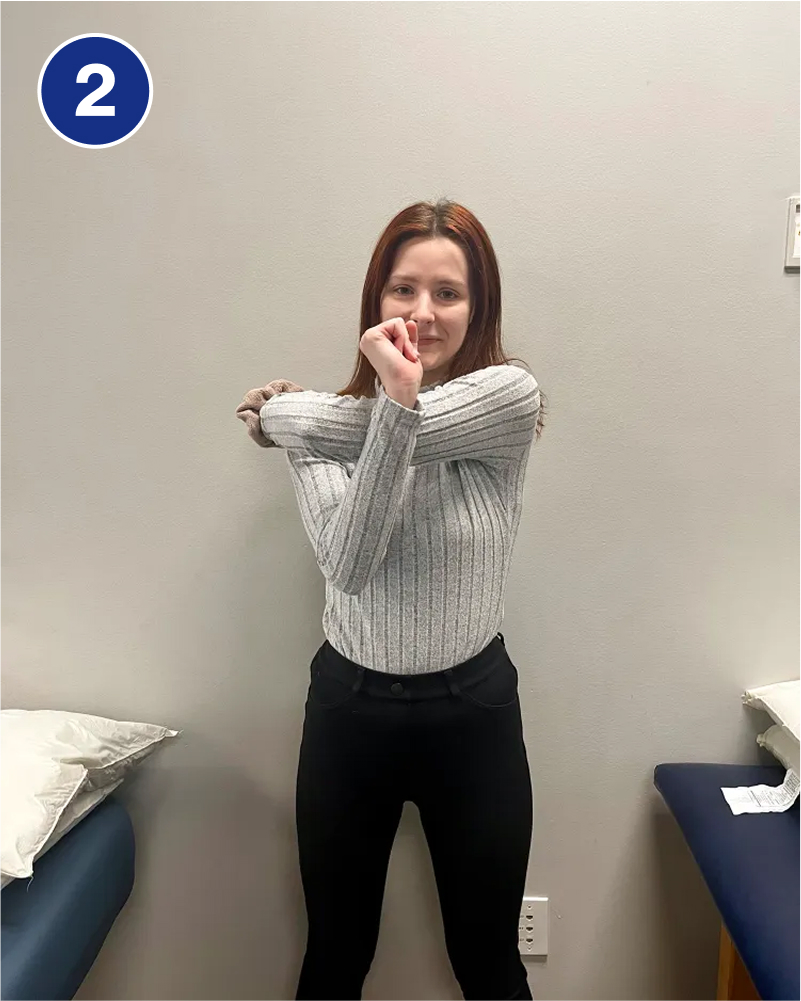 • Place the opposite hand on the outside of your elbow and gently hug your arm across your body