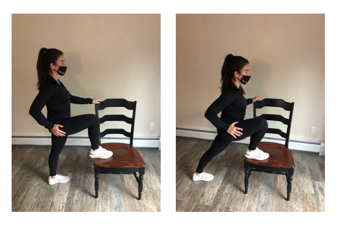 - Stand on the leg you’d like to stretch, placing the sole of your other foot firmly on the chair